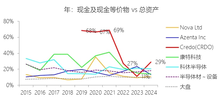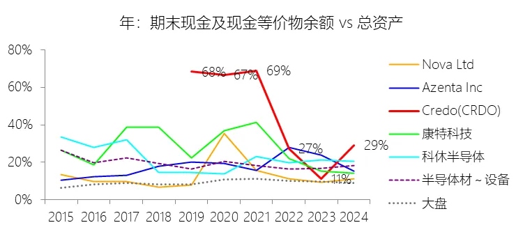 现金及现金等价物:2026财年第三季末,CredoTechnologyGroupHoldingLtd的现金及现金等价物为12.20亿美元,对比年初增长416.43%,与总资产的比例为59.90%,同比上升18.34个百分点;2016-2025财年(十年),此项合计为8.49亿美元,平均比例为34.68%,比半导体材料与设备行业的均值高16.48个百分点,长期呈下降趋势。
