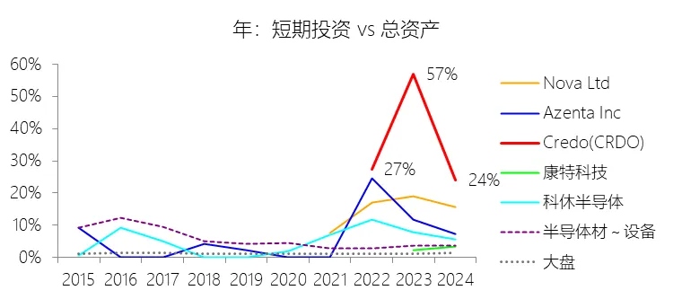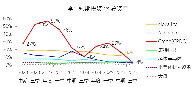 短期投资:2026财年第三季末,CredoTechnologyGroupHoldingLtd的短期投资为0.81亿美元,对比年初减少58.46%,与总资产的比例为3.98%,同比下降7.14个百分点;2016-2025财年(十年),此项合计为6.47亿美元,平均比例为26.45%,比半导体材料与设备行业的均值高21.71个百分点,长期呈下降趋势。