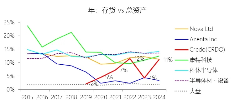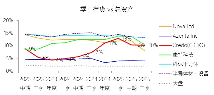 存货:2026财年第三季末,CredoTechnologyGroupHoldingLtd的存货为2.08亿美元,对比年初增长130.99%,与总资产的比例为10.21%,同比上升2.81个百分点;2016-2025财年(十年),此项合计为1.99亿美元,平均比例为8.12%,比半导体材料与设备行业的均值低5.04个百分点,长期呈上升趋势。
