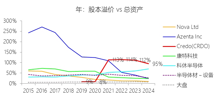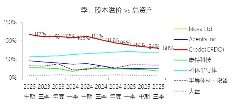 股本溢价:2026财年第三季末,CredoTechnologyGroupHoldingLtd的股本溢价为16.27亿美元,对比年初增长112.6%,与总资产的比例为79.85%,同比下降22.71个百分点;2016-2025财年(十年),此项合计为23.43亿美元,平均比例为95.71%,比半导体材料与设备行业的均值高57.7个百分点,长期呈上升趋势。