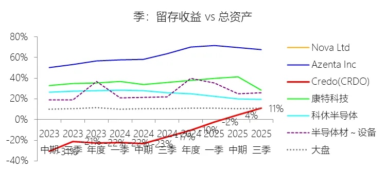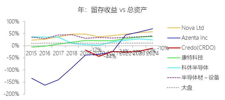 留存收益:2026财年第三季末,CredoTechnologyGroupHoldingLtd的留存收益为2.20亿美元,与总资产的比例为10.80%,同比上升27.43个百分点;2016-2025财年(十年),此项合计为-5.03亿美元,平均比例为-20.55%,比半导体材料与设备行业的均值低56.68个百分点,长期呈上升趋势。