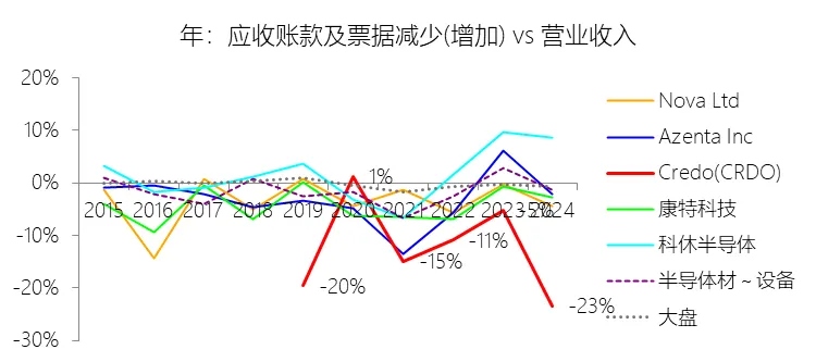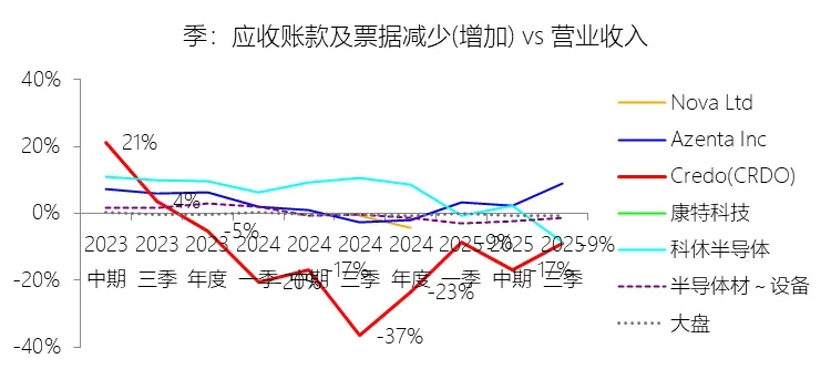 应收账款及票据减少(增加):2026财年前三季,CredoTechnologyGroupHoldingLtd的应收账款及票据减少(增加)为-0.81亿美元,绝对值同比减少16.83%,与营业收入的比例为-9.03%,同比上升27.51个百分点;2016-2025财年(十年),此项合计为-1.58亿美元,平均比例为-15.33%,比半导体材料与设备行业的均值低13.71个百分点,长期呈下降趋势。