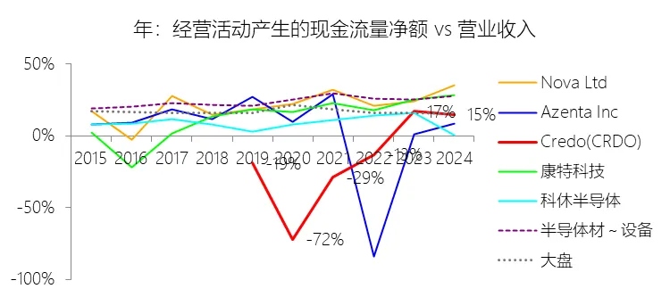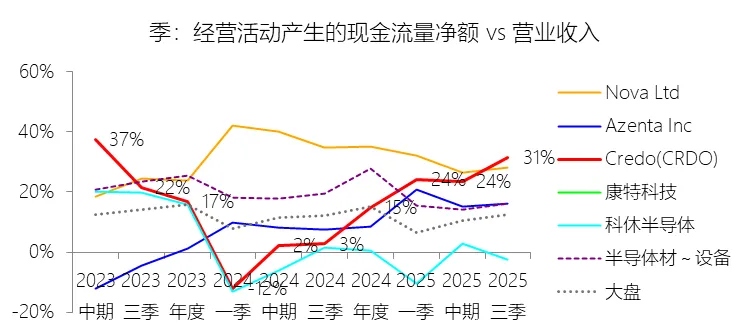 经营活动产生的现金流量净额:2026财年前三季,CredoTechnologyGroupHoldingLtd的经营活动产生的现金流量净额为2.82亿美元,同比增长3784.45%,与营业收入的比例为31.40%,同比上升28.68个百分点;2016-2025财年(十年),此项合计为-0.10亿美元,平均比例为-0.99%,比半导体材料与设备行业的均值低26.01个百分点,长期呈上升趋势。比例短期上升主要由于盈利能力的爆发式增长以及高额非现金支出的调节作用。2026财年前三季,公司实现净利润3.03亿美元,同比大幅扭亏,且由于公司正处于高速成长期,账面计提了高达1.33亿美元的以股票为基础的补偿费用(SBC)以及0.19亿美元的折旧与摊销,这些非现金项目在现金流量表中被重新加回;尽管由于AEC产品大规模部署导致存货和应收账款等营运资金占用增加了约2.09亿美元,但强劲的净利润和非现金开支回拨仍驱动经营性现金流净额创下历史新高。比例长期上升主要由于公司从单一IP授权向以AEC为核心的系统级产品业务转型的成功执行。随着AI和机器学习对带宽需求的爆发,公司AEC业务在超大规模数据中心客户中实现了从验证到大规模上量的跨越,带动公司在2025财年跨过盈亏平衡点并进入利润释放期;这种业务结构的优化使得公司不仅在利润端持续改善,在现金回笼能力上也随营收规模的扩大而产生显著的营运杠杆,推动现金流占比长期向上修复。比例低于半导体材料与设备行业的均值主要由于公司长期处于高强度的技术研发期和资本开支密集的产品化早期阶段。在过去十年的大部分时间内,Credo作为挑战者,需投入远超行业均值的研发费用(十年平均研发费用率达41.5%)以维持SerDes和DSP技术的领先地位,导致在营收基数较小时长期处于经营性亏损状态;相比该行业组中如阿斯麦(ASML)、应用材料(AMAT)等已步入成熟收获期、拥有极高利润壁垒和稳定现金回笼能力的行业巨头,Credo在统计期间内大部分年份的经营现金流受限于早期亏损和Fabless模式转型过程中对营运资本的持续消耗,导致其十年平均比例显著偏低。