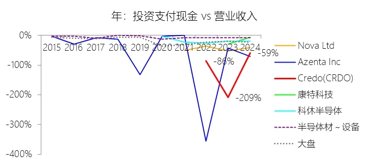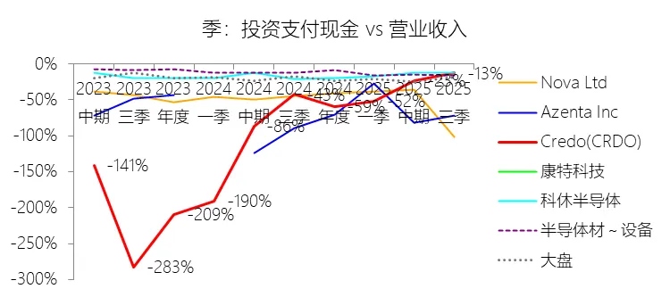 投资支付现金:2026财年前三季,CredoTechnologyGroupHoldingLtd的投资支付现金为-1.15亿美元,绝对值同比增长1.13%,与营业收入的比例为-12.80%,同比上升29.83个百分点;2016-2025财年(十年),此项合计为-8.22亿美元,平均比例为-79.53%,比半导体材料与设备行业的均值低72.4个百分点,长期呈上升趋势。