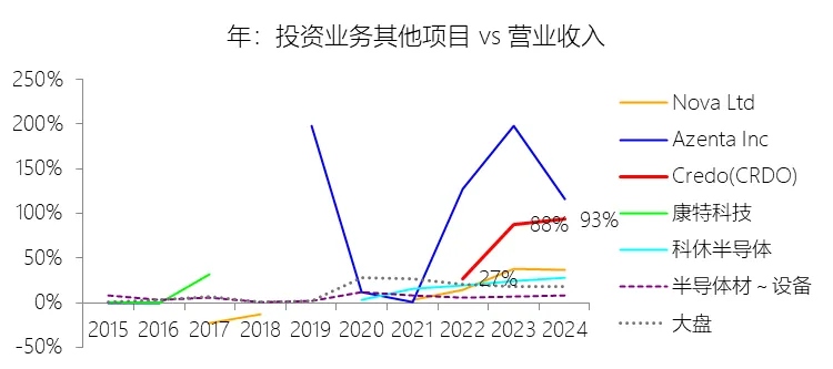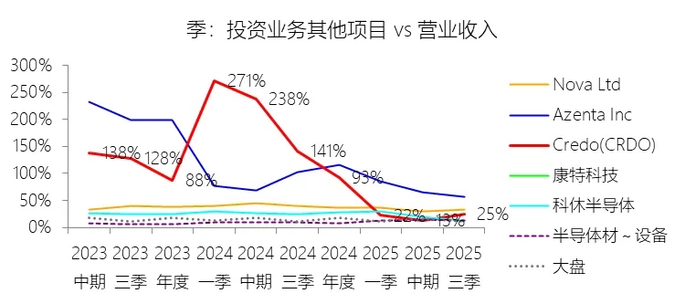 投资业务其他项目:2026财年前三季,CredoTechnologyGroupHoldingLtd的投资业务其他项目为2.29亿美元,同比减少39.22%,与营业收入的比例为25.50%,同比下降115.75个百分点;2016-2025财年(十年),此项合计为6.27亿美元,平均比例为60.65%,比半导体材料与设备行业的均值高54.22个百分点,长期呈上升趋势。