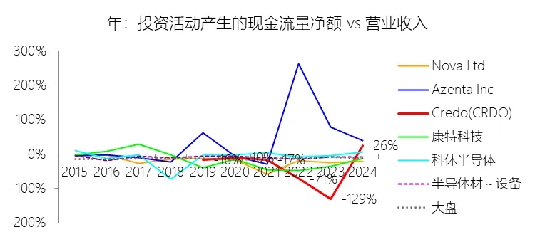 投资活动产生的现金流量净额:2026财年前三季,CredoTechnologyGroupHoldingLtd的投资活动产生的现金流量净额为-0.21亿美元,与营业收入的比例为-2.35%,同比下降88.82个百分点;2016-2025财年(十年),此项合计为-3.01亿美元,平均比例为-29.13%,比半导体材料与设备行业的均值低19.63个百分点,长期呈下降趋势。比例短期下降主要由于投资活动现金流向的逆转与营业收入爆发式增长的共同作用。2026财年前三季,公司投资活动产生的现金流量净额由去年同期的2.31亿美元净流入转为0.21亿美元净流出,主要原因是去年同期受益于高达3.77亿美元的大额定期存单到期收回,而本期公司完成了对Hyperlume公司总计8256万美元的现金收购,且为了支持AEC(有源电缆)等新产品的快速上量和技术研发,购买固定资产(如光罩和实验室设备)的现金支出同比大幅增长62%至0.53亿美元;加之同期营业收入同比增长236.69%产生的强力摊薄效应,导致该比例显著下滑。比例长期下降主要由于公司业务模式从轻资产的IP授权向资本开支相对较高的系统级产品(AEC、IC及Chiplet)战略转型。随着产品矩阵向400G、800G及1.6T高速连接领域演进,公司需持续投入大量资金用于新产品的光罩(Mask sets)采购、计算机辅助设计工具(CAD)许可及实验室测试设备的更新,且随着公司规模扩大,通过并购(如Acacia相关资产及Hyperlume)来获取核心技术和市场的频率增加,导致投资性现金流出呈长周期的扩张趋势。比例低于半导体材料与设备行业的均值主要由于公司处于高成长期的资产扩充阶段,其资本支出占营收的比例具有明显的超前性。相比行业组中如阿斯麦(ASML)、应用材料(AMAT)等已进入成熟期、拥有稳定折旧周期和庞大营收基数的巨头,Credo作为高速连接领域的挑战者,在开创AEC这一全新产品类别时,必须在收入规模尚未完全释放前,提前支付高昂的研发资本化支出和技术授权费;此外,公司利用IPO及ATM融资获得的大量现金通过定期存单进行频繁的短期投资运作,其在现金流量表中产生的剧烈波动和净流出比例,反映了成长型芯片企业特有的资金运用特征,导致其十年平均比例显著低于行业整体水平。
