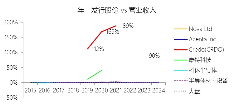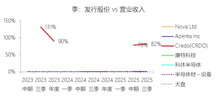 发行股份:2026财年前三季,CredoTechnologyGroupHoldingLtd的发行股份为7.36亿美元,与营业收入的比例为81.99%,同比上升81.99个百分点;2016-2025财年(十年),此项合计为5.35亿美元,平均比例为51.77%,比半导体材料与设备行业的均值高50.59个百分点,长期呈下降趋势。