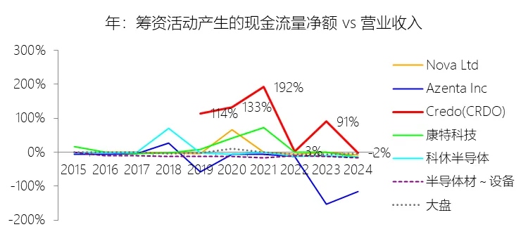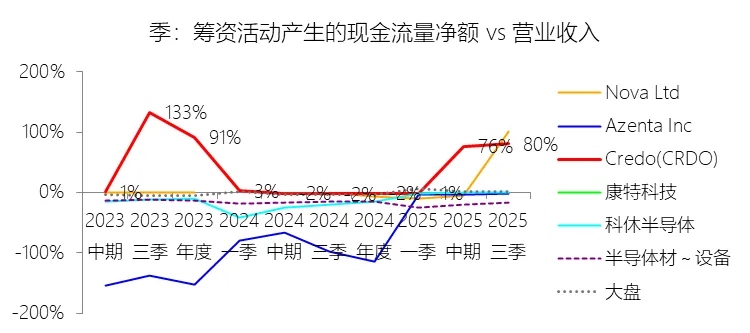 筹资活动产生的现金流量净额:2026财年前三季,CredoTechnologyGroupHoldingLtd的筹资活动产生的现金流量净额为7.23亿美元,与营业收入的比例为80.50%,同比上升82.66个百分点;2016-2025财年(十年),此项合计为5.16亿美元,平均比例为49.93%,比半导体材料与设备行业的均值高61.99个百分点,长期呈下降趋势。比例短期上升主要由于公司在2026财年前三季完成了大规模的ATM(市价发行)股权融资,带来了高达7.36亿美元的净现金流入,占该期筹资活动现金流净额的绝大部分;尽管此前已讨论过同期营业收入因AEC(有源电缆)产品大规模部署而实现爆发式增长,但该项融资规模的跨越式提升使得筹资活动占营收的比例仍呈现显著的跳跃式上升。比例长期下降主要由于随着公司业务战略从IP授权向系统级产品转型的成功执行,营业收入在过去九年间实现了711.32%的巨幅增长,收入基数的迅速扩大对筹资活动现金流产生了明显的摊薄作用;此外,公司已在2025财年实现扭亏为盈,随着盈利能力的增强和经营现金流的显著改善,公司逐步从依赖外部融资转向内部资金支持,使得筹资比例在跨过早期多轮融资及IPO的巅峰后呈自然下降趋势。比例高于半导体材料与设备行业的均值主要由于公司作为高速连接领域的成长型领军企业,在过去十年的大部分时间内处于高强度的技术研发和市场开拓期,需高度依赖股权资本市场融资(包括IPO前的优先股注资、IPO募资以及后续公开发行)来支撑其远超行业均值的资产扩张和研发投入;相比该行业组中如阿斯麦(ASML)、应用材料(AMAT)等已进入成熟收获期、具备极强获利能力和稳定内部现金流储备的巨头企业,Credo这种依靠频繁且高效的外部融资驱动增长的模式,导致其筹资活动净额占营业收入的比例显著偏高。