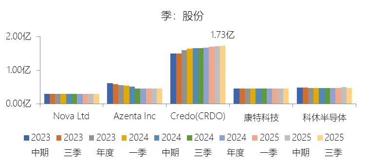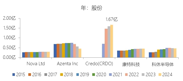 股份增长率:2026财年第三季末,CredoTechnologyGroupHoldingLtd的股份为1.73亿股,对比年初增长3.44%,增速同比(去年同期)下降0.5个百分点;2016-2025财年(九年)增长140.62%,年复合增长34%,比半导体材料与设备行业的复合增速高24.75个百分点,长期呈下降趋势。