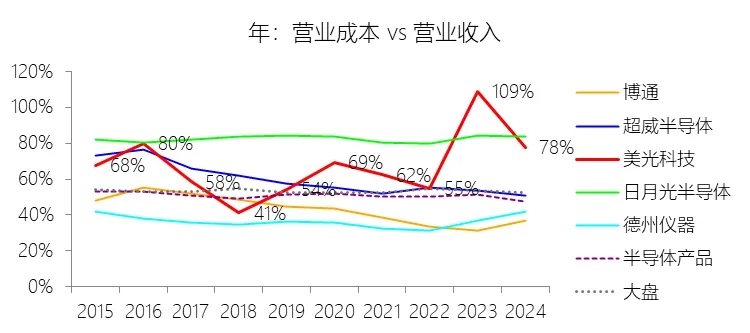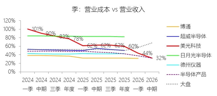 营业成本:2026财年中期,美光科技的营业成本为121.02亿美元,同比增长15.8%,与营业收入的比例为32.27%(营业成本率,即1-毛利率),同比下降30.08个百分点;2015-2024财年(十年),此项合计为1434.40亿美元,平均比例为64.25%,比半导体产品行业的均值高13.64个百分点,长期呈上升趋势。