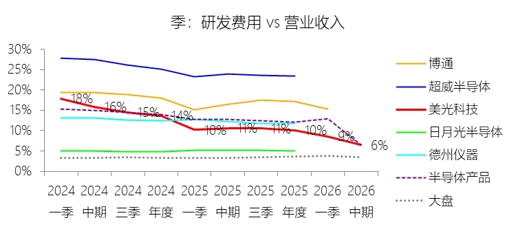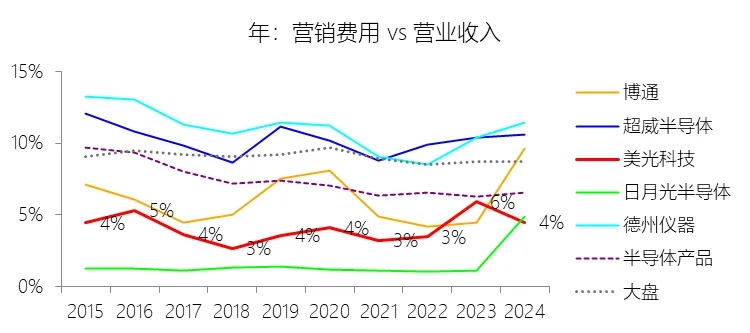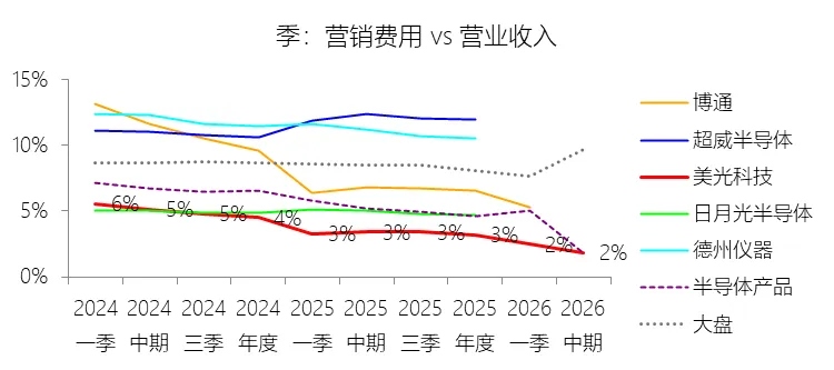 营销费用:2026财年中期,美光科技的营销费用为6.81亿美元,同比增长18.85%,与营业收入的比例为1.82%,同比下降1.6个百分点;2015-2024财年(十年),此项合计为86.60亿美元,平均比例为3.88%,比半导体产品行业的均值低3.28个百分点,长期呈上升趋势。