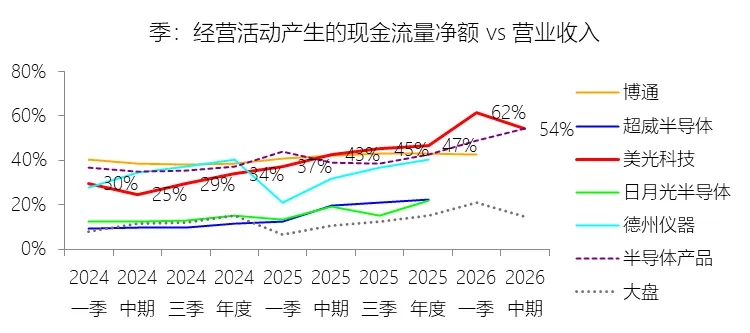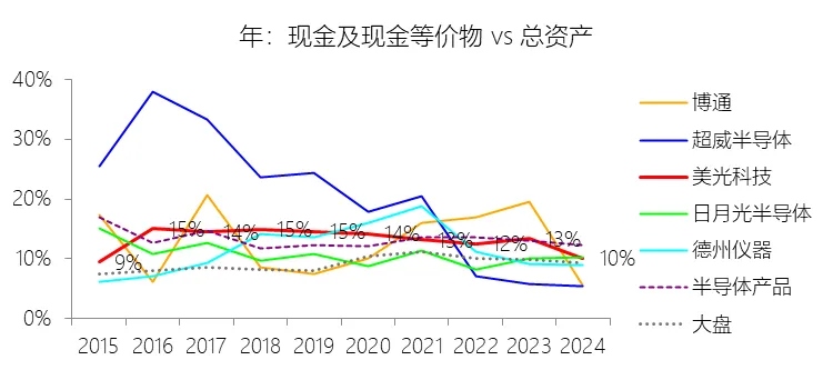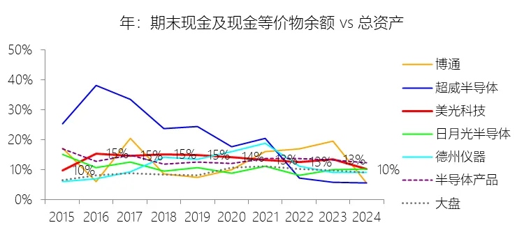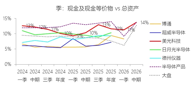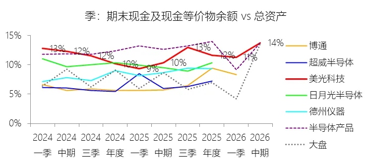 期末现金及现金等价物余额:2026财年中期末,美光科技的期末现金及现金等价物余额为139.34亿美元,对比年初增长44.45%,与总资产的比例为13.73%,同比上升3.37个百分点;2015-2024财年(十年),此项与总资产的平均比例为13.28%,比半导体产品行业的均值高0.02个百分点,长期呈下降趋势。