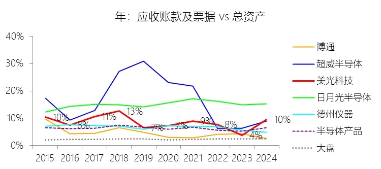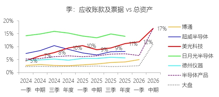 应收账款及票据:2026财年中期末,美光科技的应收账款及票据为173.14亿美元,对比年初增长86.88%,与总资产的比例为17.06%,同比上升8.15个百分点;2015-2024财年(十年),此项与总资产的平均比例为8.22%,比半导体产品行业的均值高1.99个百分点,长期呈下降趋势。比例短期上升主要由于人工智能(AI)驱动的内存和存储需求在2026财年中期爆发,导致营业收入同比大幅增长123.74%,直接推动了应收账款规模从年初的92.65亿美元飙升至173.14亿美元。由于短期内营业收入的增长速度远超总资产的扩张速度,且销售规模的急剧扩大使得期末未结算的贸易债权大幅增加,从而导致应收账款在总资产中的占比显著提升。比例长期下降主要由于美光科技所处的存储器行业具有极高的资本密集度,公司为保持技术领先和产能竞争力,在2015至2024财年期间持续进行大规模资本支出,投入资金用于建设晶圆厂及购置工艺设备(如EUV岩刻机),导致物业、厂房及设备(PP&E)等固定资产规模持续显著扩张。尽管应收账款随营收周期波动,但公司总资产基数在长期的技术迭代与产能扩产中增长更为稳健且幅度更大(九年复合增长12.45%),使得应收账款在资产总量中的相对权重在长期视角下呈现被动稀释的下降趋势。比例高于半导体产品行业的均值主要由于美光科技的客户结构具有高度集中化的特点,过去数年其前十大客户的收入贡献占比一直稳定在50%左右,大客户(如金士顿、英特尔等)单笔交易规模巨大且具有较强的议价能力。同时,存储产品具有较强的“大宗商品”属性,通常以高额订单形式向计算、数据中心和移动端的大型OEM厂商进行大批量销售,这种业务模式相较于半导体行业中客户群体更分散的模拟芯片或逻辑芯片领域,天然容易在资产负债表上形成更高比例的期末应收账款余额。