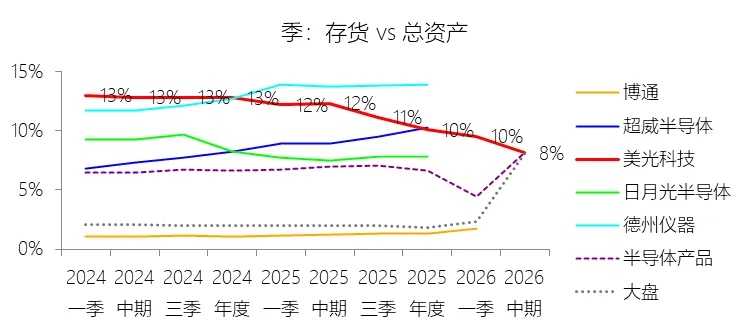 存货:2026财年中期末,美光科技的存货为82.67亿美元,对比年初减少1.05%,与总资产的比例为8.14%,同比下降4.19个百分点;2015-2024财年(十年),此项与总资产的平均比例为10.34%,比半导体产品行业的均值高3.61个百分点,长期呈上升趋势。