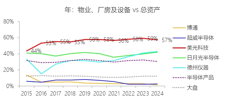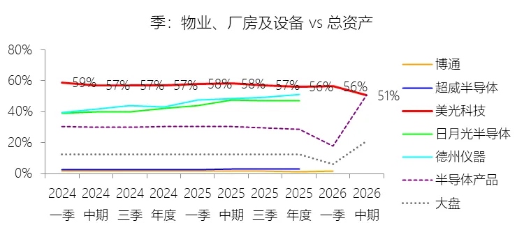 物业、厂房及设备:2026财年中期末,美光科技的物业、厂房及设备为514.08亿美元,对比年初增长10.34%,与总资产的比例为50.64%,同比下降7.57个百分点;2015-2024财年(十年),此项与总资产的平均比例为56.34%,比半导体产品行业的均值高25.15个百分点,长期呈上升趋势。