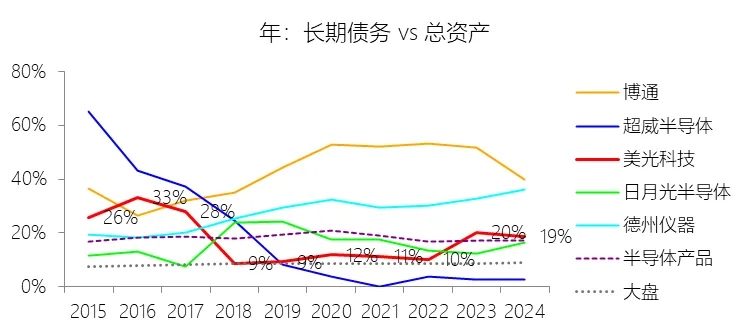 长期债务:2026财年中期末,美光科技的长期债务为95.57亿美元,对比年初减少31.82%,与总资产的比例为9.41%,同比下降9.55个百分点;2015-2024财年(十年),此项与总资产的平均比例为16.15%,比半导体产品行业的均值低1.97个百分点,长期呈下降趋势。