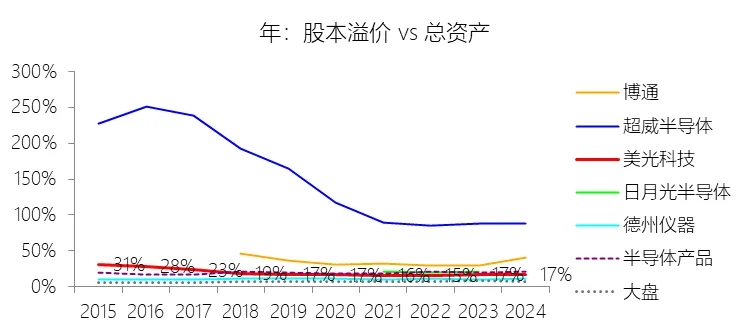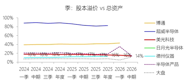 股本溢价:2026财年中期末,美光科技的股本溢价为140.92亿美元,对比年初增长5.65%,与总资产的比例为13.88%,同比下降3.52个百分点;2015-2024财年(十年),此项与总资产的平均比例为18.63%,比半导体产品行业的均值低1.01个百分点,长期呈下降趋势。