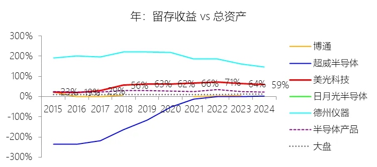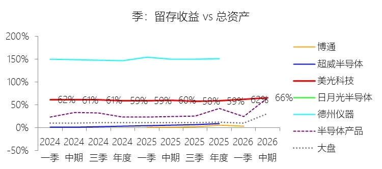 留存收益:2026财年中期末,美光科技的留存收益为668.24亿美元,对比年初增长37.55%,与总资产的比例为65.83%,同比上升5.82个百分点;2015-2024财年(十年),此项与总资产的平均比例为56.47%,比半导体产品行业的均值高30.18个百分点,长期呈上升趋势。