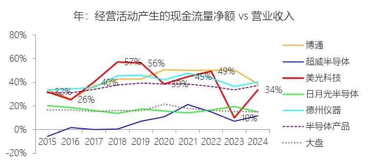 经营活动产生的现金流量净额:2026财年中期,美光科技的经营活动产生的现金流量净额为203.14亿美元,同比增长182.69%,与营业收入的比例为54.17%,同比上升11.3个百分点;2015-2024财年(十年),此项合计为931.39亿美元,平均比例为41.72%,比半导体产品行业的均值高5.42个百分点,长期呈下降趋势。比例短期上升主要由于人工智能(AI)驱动的内存和存储需求强劲增长,特别是数据中心市场对高带宽内存(HBM)及高容量模块的需求,推动2026财年中期净利润激增至190.25亿美元,进而带动经非现金项目调整后的现金获取能力显著提升。具体而言,2026财年上半年,由于定价调整导致应付客户对价增加(计入其他流动负债),以及因实施全球最低税率(Pillar Two)导致非流动所得税负债上升,这些负债项的增长显著贡献了经营性现金流入;尽管营业收入大幅增加导致应收账款同步激增,但由于净利润的爆发式增长及非现金负债项的计提,使得经营现金流的增速(182.69%)显著超过了营业收入的增速(123.74%)。比例长期下降主要由于存储行业固有的高度周期性及剧烈的价格侵蚀,在2015至2024财年期间,公司多次遭遇全球供需失衡、严重的客户库存纠正及宏观经济低迷,导致产品平均售价(ASP)的下降速度经常超过通过工艺改进实现的每吉比特成本降幅。特别是2023财年由于行业供需严重失衡和价格大幅下跌,美光不得不计提18.3亿美元的存货跌价准备;与此同时,同样的行业困境(售价暴跌和库存积压)导致了公司经营现金流从百亿级别锐减至仅15.59亿美元,严重摊薄了长期平均比例;此外,中国网络安全审查决定(CAC决定)限制了公司在关键细分市场的业务机会,以及研发复杂度的不断提升带来的运营开支增长,也对长期现金流强度产生了负面影响。比例高于半导体产品行业的均值主要由于存储器制造属于极度资本密集型业务,美光科技为维持技术领先,在2015至2024财年期间持续投入巨额资本用于建设晶圆厂及购置先进制程设备(如EUV岩刻机),导致其账面上拥有规模庞大的物业、厂房及设备(PP&E)资产。这使得公司每年计提的折旧和摊销(D&A)费用极高,作为非现金项目,D&A在计算经营活动产生的现金流量净额时被全额加回至净利润中,这种特殊的成本结构使得存储巨头的经营现金流在营业收入中的占比,天然显著高于半导体行业中资本密度较低、折旧负担较轻的逻辑芯片或模拟芯片等非存储细分领域。