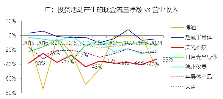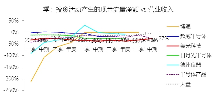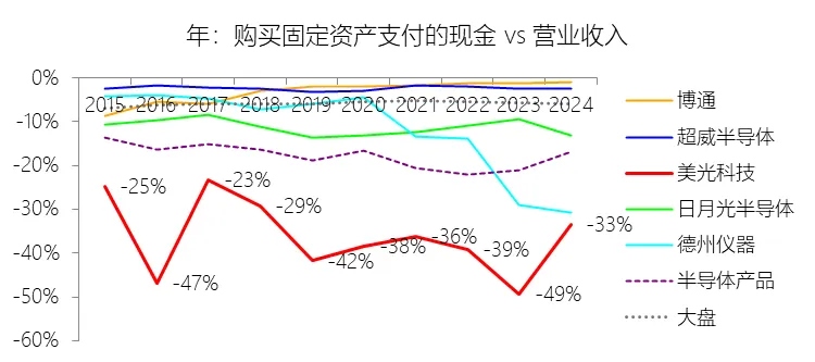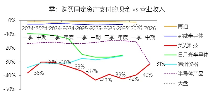 购买固定资产支付的现金:2026财年中期,美光科技的购买固定资产支付的现金为-117.76亿美元,绝对值同比增长62.18%,与营业收入的比例为-31.40%,同比上升11.92个百分点;2015-2024财年(十年),此项合计为-796.13亿美元,平均比例为-35.66%,比半导体产品行业的均值低17.42个百分点,长期呈下降趋势。