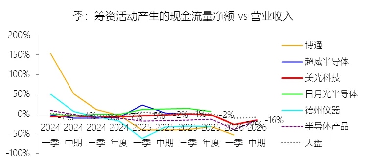 筹资活动产生的现金流量净额:2026财年中期,美光科技的筹资活动产生的现金流量净额为-59.12亿美元,绝对值同比增长1713.5%,与营业收入的比例为-15.76%,同比下降13.82个百分点;2015-2024财年(十年),此项合计为-107.75亿美元,平均比例为-4.83%,比半导体产品行业的均值高4.94个百分点,长期呈上升趋势。比例短期下降主要由于2026财年中期美光科技在人工智能驱动的业绩爆发期采取了极为激进的债务去杠杆策略,上半年偿付债务支出的现金高达46.26亿美元,其中包括全额预付了2028年到期票据、2029年多期票据及2029年定期贷款A,这一偿债规模远超去年同期的26.26亿美元。与此同时,公司显著加大了回购力度,上半年用于回购股份及结算员工股权激励代扣税款的现金合计达11.95亿美元,而去年同期仅为2.52亿美元。尽管同期营业收入实现了123.74%的爆发式增长,但上述筹资活动现金流出的绝对值增速(1713.5%)远超收入增速,导致筹资活动净流出占营收的比例显著下降。比例长期上升主要由于美光科技在2015至2024财年期间资本结构的战略性优化,公司逐步完成了对2010年代中期具有高稀释性的巨额可转换债券的现金结算,减轻了长期重组压力。在存储行业的剧烈波动中,美光利用其IDM模式的财务韧性,在行业低迷期(如2023财年)通过发行高达67.16亿美元的债券和贷款来储备流动性,这种周期性的巨额融资流入在一定程度上冲抵了常规年度的偿债和分红支出,使得长期平均比例呈现向零值回归的上升趋势。比例高于半导体产品行业的均值主要由于美光科技在分红和回购政策上相较于博通或德州仪器等半导体同行更为审慎和具周期性:美光直到2021财年末才开始支付季度股息,且其分红率长期远低于行业平均水平。此外,由于存储器业务属于极度资本密集型,美光必须保留更多现金用于制程演进,其股份回购计划在行业景气度下滑时往往会果断缩减或暂停,这种对股东回馈金额的控制,加上因技术竞赛产生的定期大额债务融资,使得其筹资活动净流出的相对规模天然低于那些拥有巨额、稳定股东返还计划的轻资产半导体巨头。