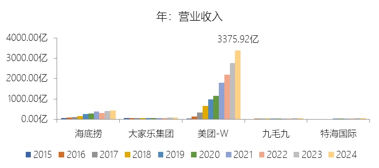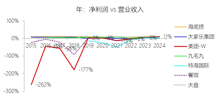 营业收入增长率:2025年,美团-W的营业收入为3648.55亿元,同比增长8.08%,增速同比下降13.91个百分点;2015-2024年(九年)增长8299.98%,年复合增长63.61%,比餐馆行业的复合增速高32.83个百分点,长期呈下降趋势。增速短期下降主要由于行业竞争在2025年显著加剧,美团-W为了应对激烈的市场环境、提升品牌影响力及价格竞争力,不断调整业务策略并加强营销与推广力度,导致核心本地商业分部在收入中抵扣的用户补贴大幅增加,从而直接摊薄了当期的营收增速;同时,公司于2025年战略性地关停了“美团优选”业务,虽然新业务分部整体仍录得增长,但该项业务的结构性变动对营收增速的短期表现产生了一定影响。增速长期下降主要由于随着公司营收基数的迅速扩大,高增长的难度逐年递增,增速自然向稳健区间回归;此外,本地生活服务行业的线上渗透率已达到较高水平,公司业务重点已从早期的纯用户扩张转向追求高质量增长与运营效率提升,且在业务发展过程中持续面对宏观环境演变及不断变化的消费者偏好,使得整体增速动能趋于平缓。增速高于餐馆行业的复合增速主要由于美团-W并非传统的餐饮服务提供商,而是建立在强大配送网络和技术基础上的本地生活服务平台,其业务范畴远超单一的餐馆行业,涵盖了餐饮外卖、到店酒旅及以“美团闪购”、“小象超市”为代表的多种非餐饮零售业务;公司依托“万物到家”的消费者心智,通过跨业务线的交叉销售和多元化供给,不仅引领了餐馆行业的数字化转型,更在即时零售等新兴领域实现了规模效应,从而在长期内保持了远高于传统餐馆行业平均水平的复合增长率。