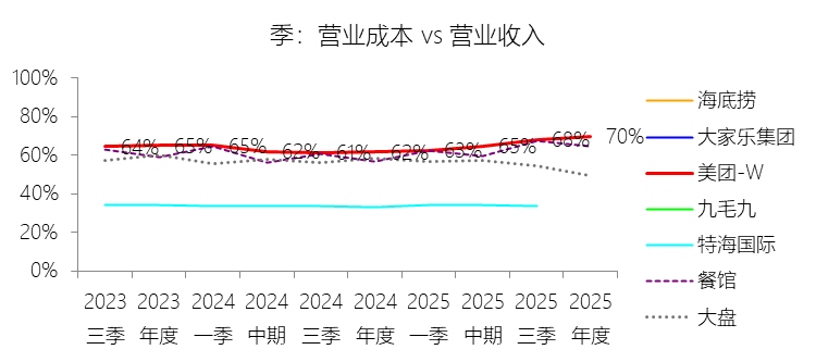 营业成本:2025年,美团-W的营业成本为2538.46亿元,同比增长22.15%,与营业收入的比例为69.57%(营业成本率,即1-毛利率),同比上升8.02个百分点;2015-2024年(十年),此项合计为9082.86亿元,平均比例为67.69%,比餐馆行业的均值高7.48个百分点,长期呈上升趋势。