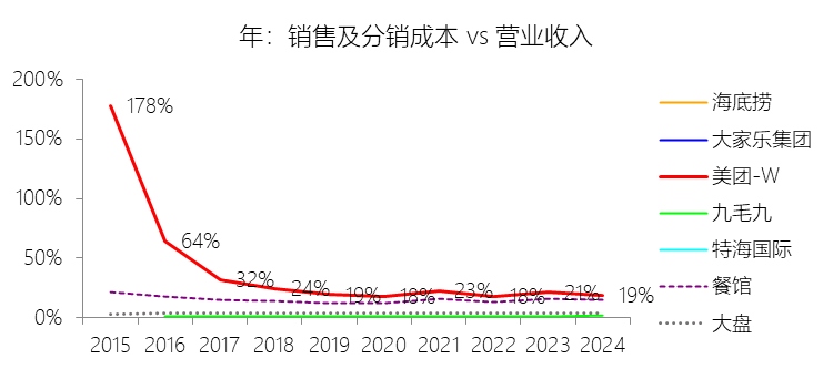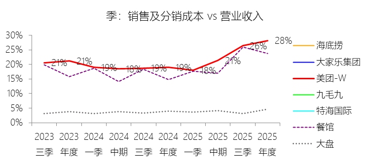销售费用:2025年,美团-W的销售及分销成本为1029.34亿元,同比增长60.9%,与营业收入的比例为28.21%(销售费用率),同比上升9.26个百分点;2015-2024年(十年),此项合计为2849.81亿元,平均比例为21.24%,比餐馆行业的均值高6.62个百分点,长期呈下降趋势。