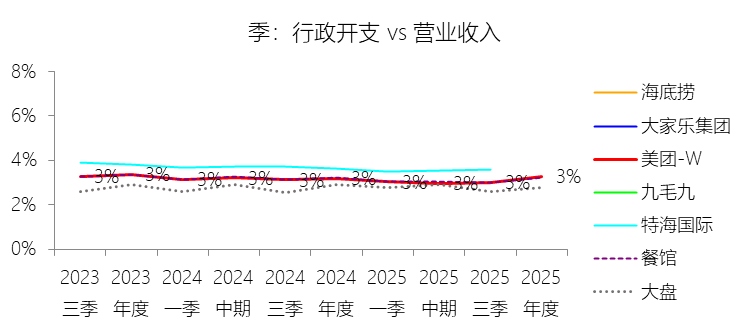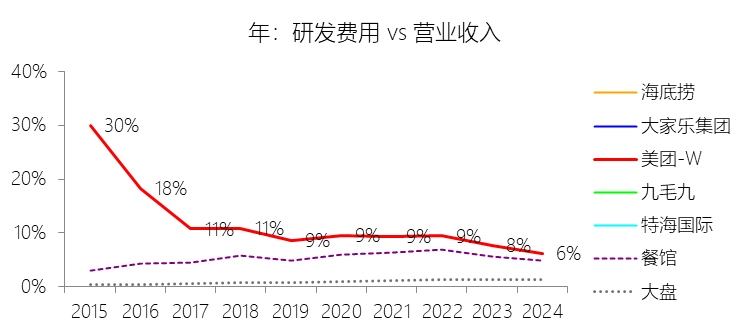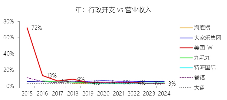 管理费用:2025年,美团-W的行政开支为119.16亿元,同比增长11.07%,与营业收入的比例为3.27%(管理费用率),同比上升0.09个百分点;2015-2024年(十年),此项合计为607.64亿元,平均比例为4.53%,比餐馆行业的均值高0.35个百分点,长期呈下降趋势。