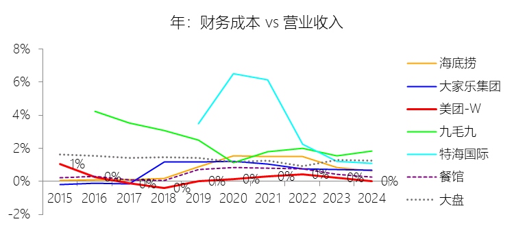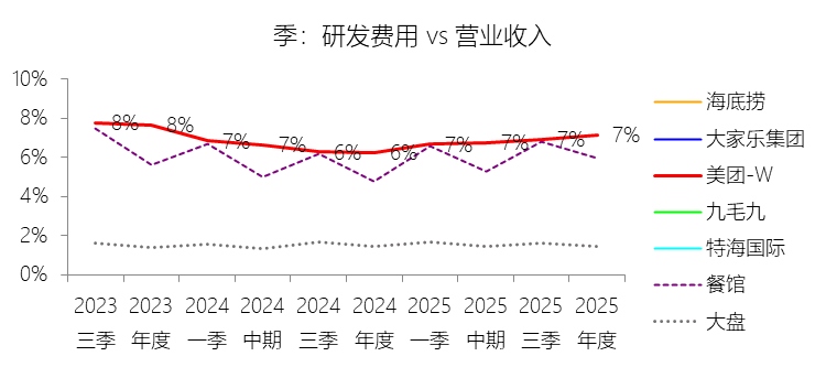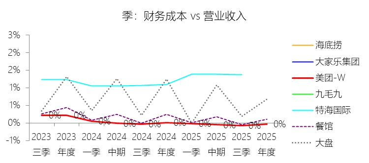 财务费用:2025年,美团-W的财务成本为-1.25亿元,与营业收入的比例为-0.03%,同比下降0.05个百分点;2015-2024年(十年),此项合计为21.75亿元,平均比例为0.16%,比餐馆行业的均值低0.34个百分点,长期呈下降趋势。