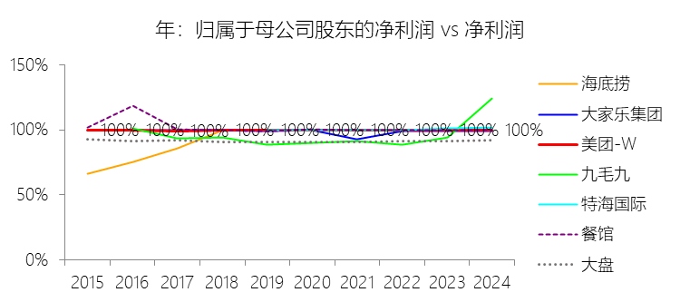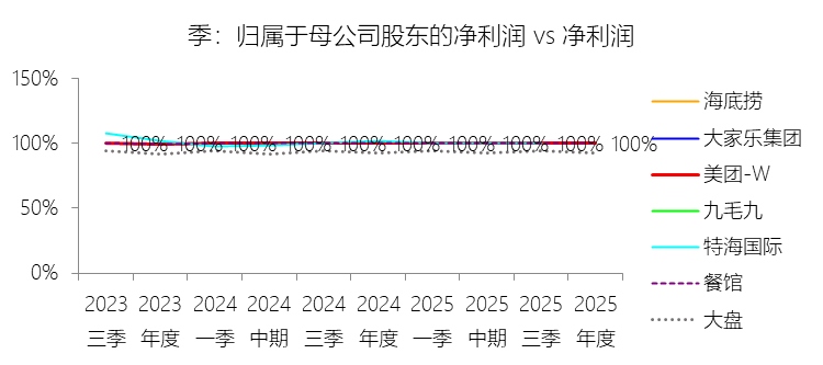 归属于母公司股东的净利润:2025年,美团-W的归属于母公司股东的净利润为-233.55亿元,与净利润的比例为100.00%,同比略微上升;2015-2024年(十年),此项合计为-1243.17亿元,平均比例为99.93%,比餐馆行业的均值低0.64个百分点,长期呈上升趋势。