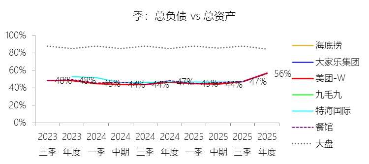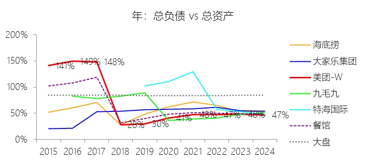 负债率:2025年末,美团-W的总负债为1959.22亿元,对比年初增长29.11%,与总资产的比例为56.48%(负债率),同比上升9.69个百分点;2015-2024年(十年),此项与总资产的平均比例为54.63%,比餐馆行业的均值高0.01个百分点,长期呈下降趋势。比例短期上升主要由于2025年公司录得233.54亿元的巨额净亏损,且经营活动产生的现金流量净额由正转负(-138.15亿元),导致内生资金不足以支撑运营与扩张;为应对行业竞争加剧并维持业务运转,公司大幅增加了债务融资,其中长期借款对比年初惊人地增长了1499.03%至187.89亿元,短期借款也由微量激增至34.68亿元,同时非流动应付票据增长23.96%至471.15亿元,这种融资结构的剧变直接推高了当期的负债水平。比例长期下降主要由于在2015至2017年间,公司负债率处于140%以上的极高水平,这主要与IPO前可转换可赎回优先股的会计处理有关;随着2018年公司上市后相关工具转为权益,以及核心业务规模效应显现带来的盈利能力一度修复,负债结构得到了显著优化,促使负债率从早期的极端高位逐年向稳健区间回归。比例高于餐馆行业的均值主要由于美团-W作为科技零售平台,其负债构成中包含了远高于传统餐饮行业的应付票据及长期债务,其十年平均非流动应付票据比例为8.80%,比餐馆行业均值高出2.29个百分点,反映了平台型企业利用债权市场进行大规模技术研发与生态扩张的特征;此外,凭借其庞大的交易生态,公司维持着较高的应付账款及票据水平,十年平均比例比行业均值高出1.64个百分点,这种对供应链资金的占场能力也是其负债率长期略高于传统餐饮企业的结构性原因。