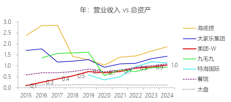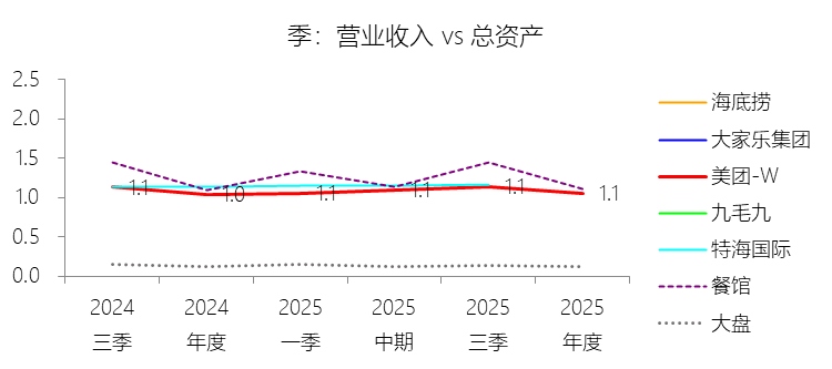 总资产周转率:2025年,美团-W的总资产周转率为1.1次,同比上升0.01次;2015-2024年(十年),平均总资产周转率为0.8次,比餐馆行业的均值低0.09次,长期呈上升趋势。