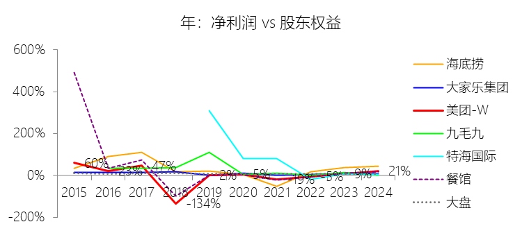 净利率:2025年,美团-W的净利润为-233.54亿元,与营业收入的比例为-6.40%(净利率),同比下降17.01个百分点;2015-2024年(十年),此项合计为-1244.07亿元,平均比例为-9.27%,比餐馆行业的均值低3.5个百分点,长期呈上升趋势。比例短期下降主要由于2025年行业竞争显著加剧,公司为提升品牌影响力及价格竞争力,在核心本地商业分部大幅增加了用户补贴、推广及广告开支,导致销售费用同比增长60.9%,销售费用率同比上升9.26个百分点;同时,为了在竞争中确保服务质量,公司提高了骑手补贴及福利,加之食杂零售及海外业务持续扩张,导致营业成本率上升8.02个百分点,核心业务毛利率下降;此外,公司在AI等前沿技术领域的研发投入增加,以及海外业务处于早期投资阶段所带来的经营亏损,进一步摊薄了当期的利润比例。比例长期上升主要由于随着业务规模的扩大,公司核心本地商业分部的经营效率和经济规模不断提升,单位配送成本在长期内趋于优化;同时,公司战略重心从早期的纯用户扩张转向追求高质量增长,新业务(如食杂零售)的亏损率在运营优化下持续收窄,带动了整体净利率水平从早期的巨额亏损逐年向稳健区间修复。比例低于餐馆行业的均值主要由于美团-W作为科技零售平台,其成本结构与传统餐馆存在显著差异,其十年平均营业成本率(67.69%)比餐馆行业高出7.48个百分点,主要系高昂的配送相关成本及对生态系统的持续补贴所致;同时,作为技术驱动型公司,其研发费用率平均高出行业2.87个百分点,销售费用率平均高出6.62个百分点,反映了平台型企业在技术研发与市场获客上的高投入特征;此外,由于公司涉及大量金融资产投资及业务调整,影响税前利润的其他项目(如公允价值变动及资产减值)平均比例比餐馆行业低2.92个百分点,这些非经常性损益的波动也导致了整体净利率均值低于传统餐饮行业。