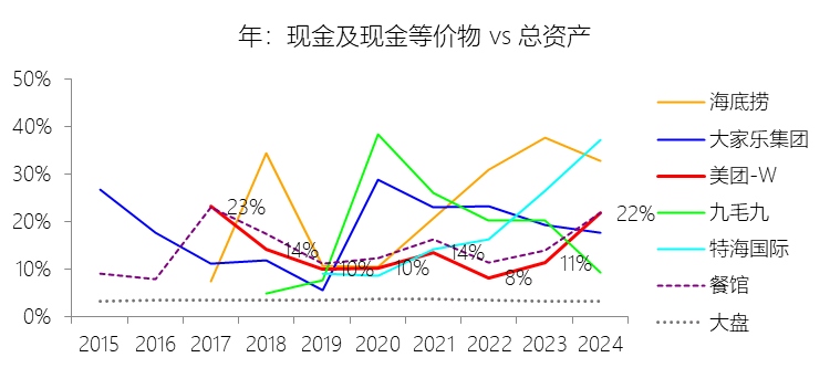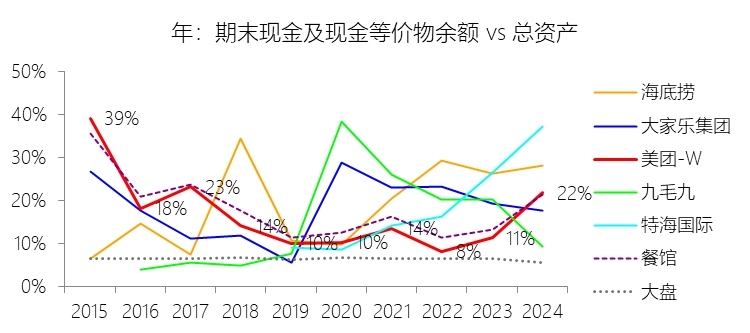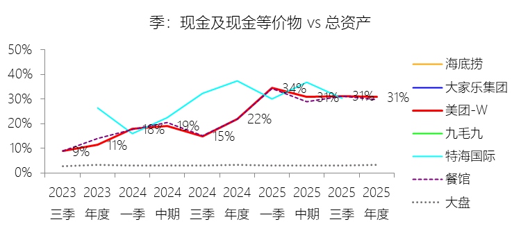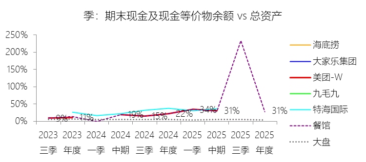 期末现金及现金等价物余额:2025年末,美团-W的期末现金及现金等价物余额为1067.71亿元,对比年初增长50.73%,与总资产的比例为30.78%,同比上升8.94个百分点;2015-2024年(十年),此项与总资产的平均比例为14.70%,比餐馆行业的均值低1.69个百分点,长期呈下降趋势。