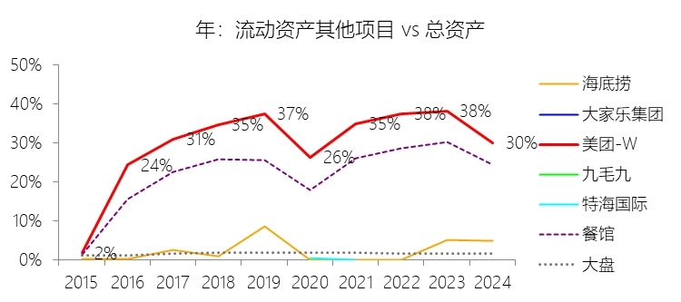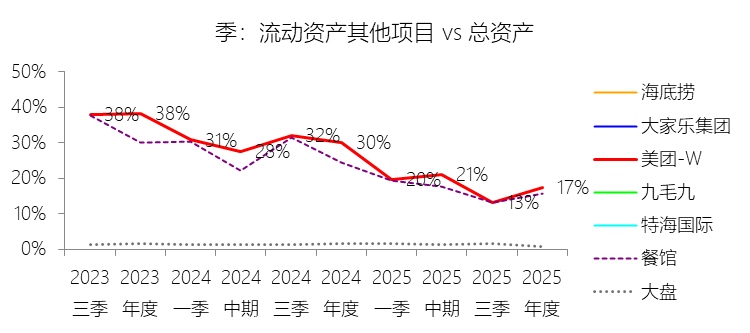 流动资产其他项目:2025年末,美团-W的流动资产其他项目为600.62亿元,对比年初减少38.34%,与总资产的比例为17.31%,同比下降12.72个百分点;2015-2024年(十年),此项与总资产的平均比例为32.94%,比餐馆行业的均值高8.3个百分点,长期呈上升趋势。
