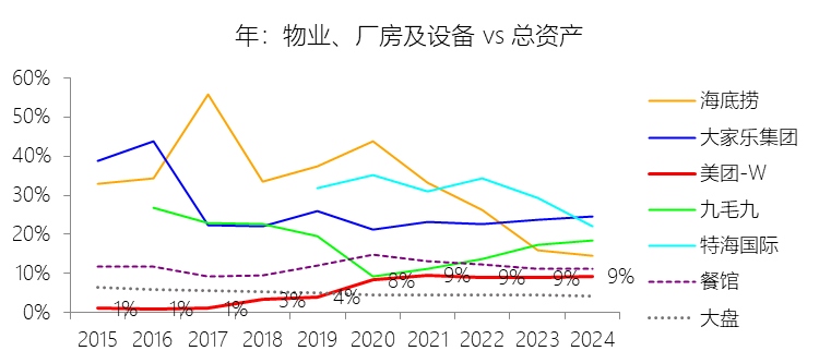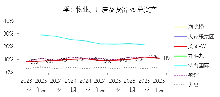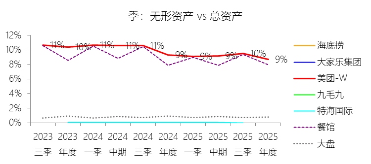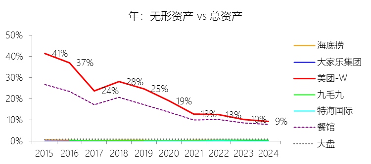 物业、厂房及设备:2025年末,美团-W的物业、厂房及设备为387.05亿元,对比年初增长28%,与总资产的比例为11.16%,同比上升1.83个百分点;2015-2024年(十年),此项与总资产的平均比例为7.43%,比餐馆行业的均值低4.5个百分点,长期呈上升趋势。