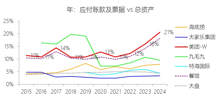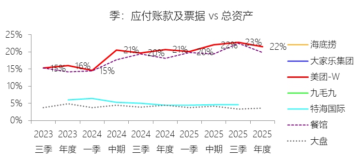 应付账款及票据:2025年末,美团-W的应付账款及票据为746.80亿元,对比年初增长11.64%,与总资产的比例为21.53%,同比上升0.9个百分点;2015-2024年(十年),此项与总资产的平均比例为14.16%,比餐馆行业的均值高1.64个百分点,长期呈上升趋势。