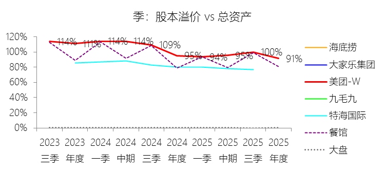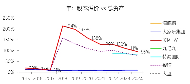 股本溢价:2025年末,美团-W的股本溢价为3174.15亿元,对比年初增长2.77%,与总资产的比例为91.50%,同比下降3.73个百分点;2015-2024年(十年),此项与总资产的平均比例为121.80%,比餐馆行业的均值高29.97个百分点,长期呈上升趋势。