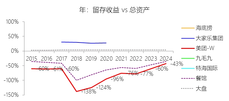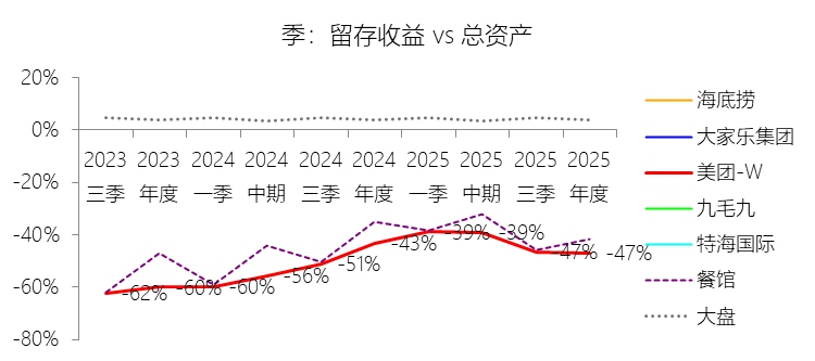 留存收益:2025年末,美团-W的留存收益为-1632.18亿元,绝对值对比年初增长16.75%,与总资产的比例为-47.05%,同比下降3.95个百分点;2015-2024年(十年),此项与总资产的平均比例为-75.54%,比餐馆行业的均值低19.9个百分点,长期呈上升趋势。