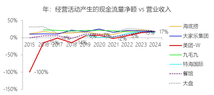 经营活动产生的现金流量净额:2025年,美团-W的经营活动产生的现金流量净额为-138.15亿元,与营业收入的比例为-3.79%,同比下降20.71个百分点;2015-2024年(十年),此项合计为1037.05亿元,平均比例为7.73%,比餐馆行业的均值低2.55个百分点,长期呈上升趋势。比例短期下降主要由于2025年行业竞争显著加剧,美团-W为提升品牌影响力及价格竞争力,在核心本地商业分部大幅增加了用户补贴、推广及广告开支,导致销售及分销成本同比增长60.9%,销售费用率同比上升9.26个百分点,全年录得233.54亿元的巨额净亏损;同时,公司持续加大对海外业务的早期投资,加之宏观环境波动影响了部分商家的营销支出意愿,以及关停“美团优选”等业务调整带来的短期阵痛,共同导致经营活动产生的现金流量净额由正转负,跌至-138.15亿元。比例长期上升主要由于随着业务规模的持续扩张,公司核心本地商业分部的经营效率和规模效应显著提升,单位配送成本在长期内趋于优化;同时,公司战略重心从早期的纯用户扩张转向追求高质量增长,新业务(如食杂零售)的经营亏损率在持续运营优化下大幅收窄,加之由于交易生态不断丰富带来的应付账款及商家款项等营运资本的增加,增强了平台对资金的占用能力,从而驱动经营现金流状况从早期的巨额流出逐步修复至稳健增长区间。比例低于餐馆行业的均值主要由于美团-W作为科技零售平台,其业务模式中包含了高昂的骑手配送相关成本,导致其十年平均营业成本率比餐馆行业高出7.48个百分点;同时,作为技术驱动型企业,其研发费用率平均高出行业2.87个百分点,销售费用率平均高出6.62个百分点,反映了平台为维持技术领先及市场份额需支付比传统餐饮业更高的获客与维护成本;此外,公司在扩张食杂零售、共享出行等新业务过程中,面临着比单一餐馆行业更为复杂的投入产出周期及资产减值等非经常性损益波动,这些结构性因素共同抑制了其经营现金流与营业收入的平均比例表现。