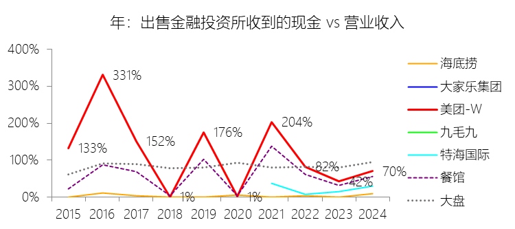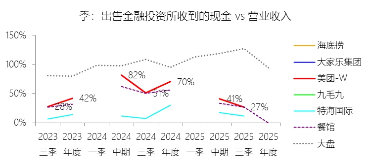出售金融投资所收到的现金:2025年,美团-W的出售金融投资所收到的现金缺数据,与营业收入的比例无效;2015-2024年(十年),此项合计为11742.69元,平均比例为87.51%,比餐馆行业的均值高27.45个百分点,长期呈下降趋势。