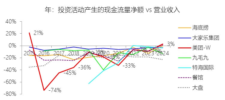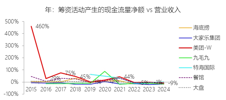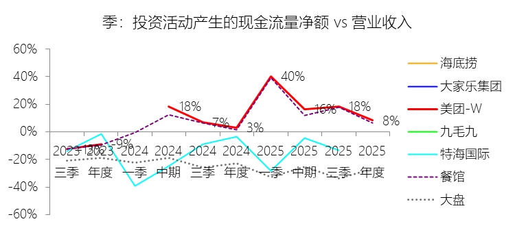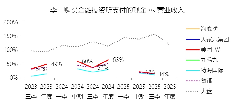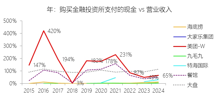 购买金融投资所支付的现金:2025年,美团-W的购买金融投资所支付的现金缺数据,与营业收入的比例无效;2015-2024年(十年),此项合计为14701.61元,平均比例为109.56%,比餐馆行业的均值高34.74个百分点,长期呈下降趋势。