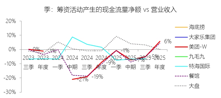 筹资活动产生的现金流量净额:2025年,美团-W的筹资活动产生的现金流量净额为212.43亿元,与营业收入的比例为5.82%,同比上升14.83个百分点;2015-2024年(十年),此项合计为1310.59亿元,平均比例为9.77%,比餐馆行业的均值高4.95个百分点,长期呈下降趋势。比例短期上升主要由于2025年公司为应对激烈的行业竞争及维持业务运营,大幅增加了债务融资力度,全年筹资活动现金流入主要来自发行应付票据及借款所得款项;尽管期间存在偿还优先票据本金及利息、赎回可换股债券及支付租赁负债等现金流出项目,但融资规模的显著扩张使得筹资活动产生的现金流量净额由2024年的负304.15亿元转为正212.43亿元,从而带动比例在短期内强劲回升。比例长期下降主要由于美团-W已从早期依赖大规模外部融资(如2015年筹资现金流占营收比例高达460.46%的初创及扩张期)转向业务成熟期,随着营收规模的跨越式增长,公司对外部资本的依赖度自然稀释;同时,公司近年来战略重心转向高质量增长,开始通过回购股份(如2024年购回及注销B类股份支付260.90亿元)及偿还债务来回馈股东并优化资本结构,导致筹资活动现金流量净额在长期内趋于下降。比例高于餐馆行业的均值主要由于美团-W作为科技零售平台,其业务扩张、技术研发及生态构建(如对自动配送、AI及海外市场的投入)具有极高的资本开支需求,其融资维度远超传统的餐饮企业;公司凭借强大的平台属性,持续利用发行美元优先票据、可换股债券等多种债权工具进行资本部署,其十年平均股本溢价比例高达121.80%,应付票据比例也显著高于餐馆行业,这种高频且大规模的资本市场运作能力是其筹资现金流比例长期领先于传统线下餐饮行业的核心原因。