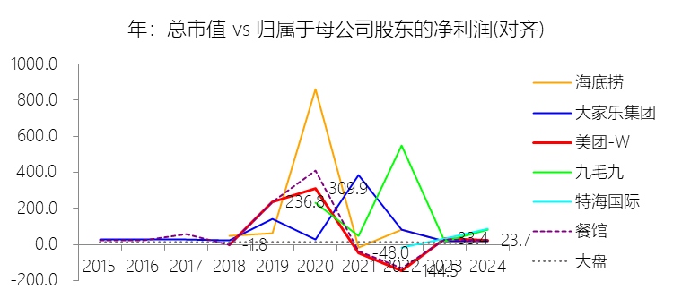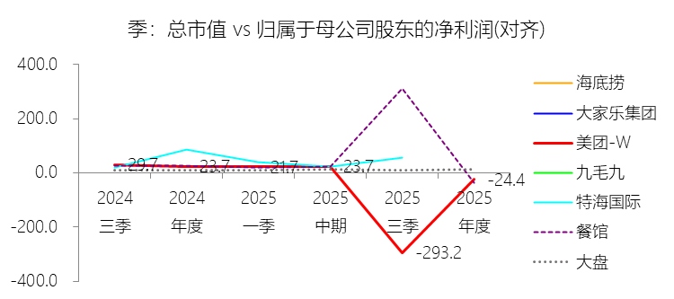 市盈率:2025年,美团-W的归属于母公司股东的净利润(对齐)为-233.55亿元,总市值与归属于母公司股东的净利润(对齐)的比例为-24.4倍(市盈率),对比年初下降48.14个倍数;2015-2024年(十年),此项合计为-890.92亿元,平均比例为-63.0倍,比餐馆行业的均值高19.63个倍数,长期呈下降趋势。