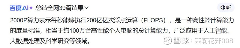 那么这“2000P”是啥概念呢?P是一个数量级,代表每秒1000万亿次浮点运算。2000P就是200亿亿,2000P算力就是能实现每秒200亿亿次运算(2 × 10^18 FLOPS)。如果以高性能个人电脑为参照,1P算力约等于500台高性能电脑的算力总和,2000P算力相当于约100万台高性能个人电脑的计算能力,这已经到了智算中心的规模了。它能够: