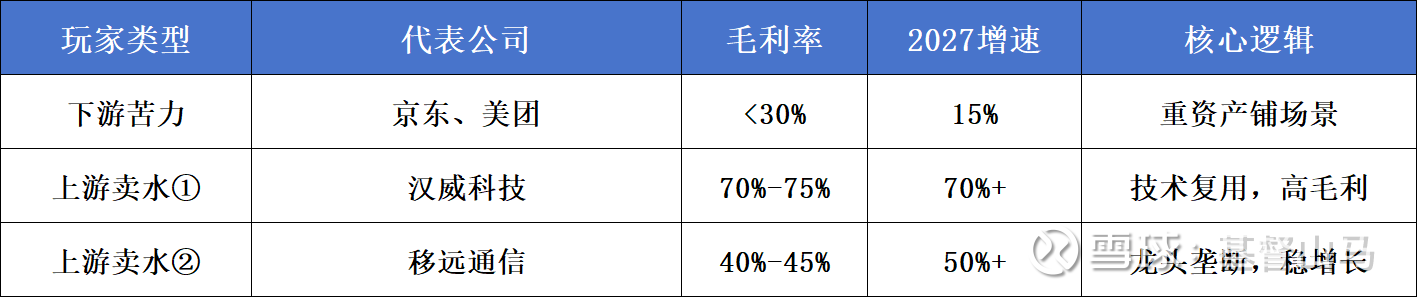 京东、美团重资产当苦力,汉威、移远轻资产赚暴利,前者增速15%,后者50%+、70%+,差距一目了然。