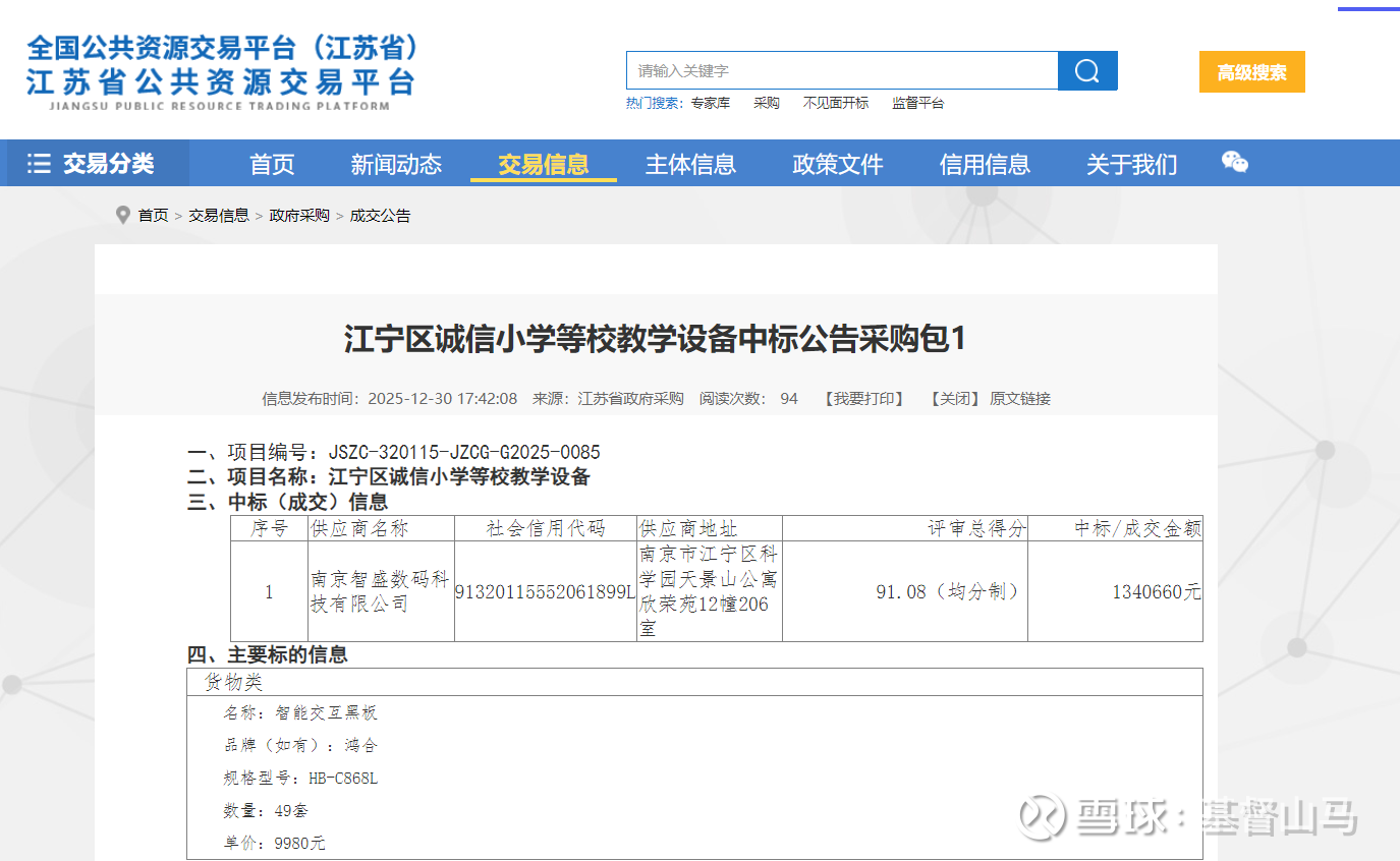 南京江宁区采购鸿合智能交互黑板,单价9980元/套,一次采购就是49套 。