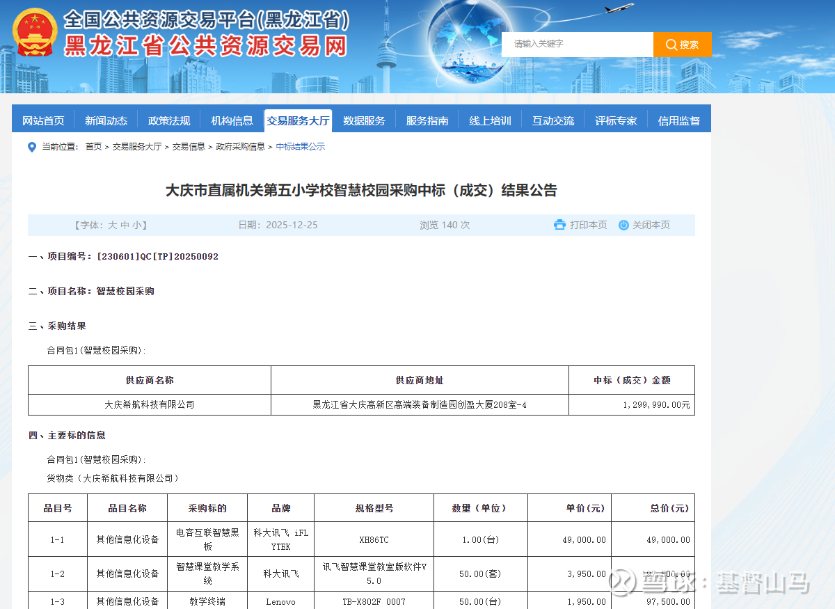 大庆市直机关第五小学的采购清单更有意思:科大讯飞智慧课堂系统(3950元/套)、智能批阅机(24万元/套)、AI听说课堂系统(2.7万元/套)、智慧体育教学系统(7.4万元/套)……林林总总加起来,单校采购金额130万元 。