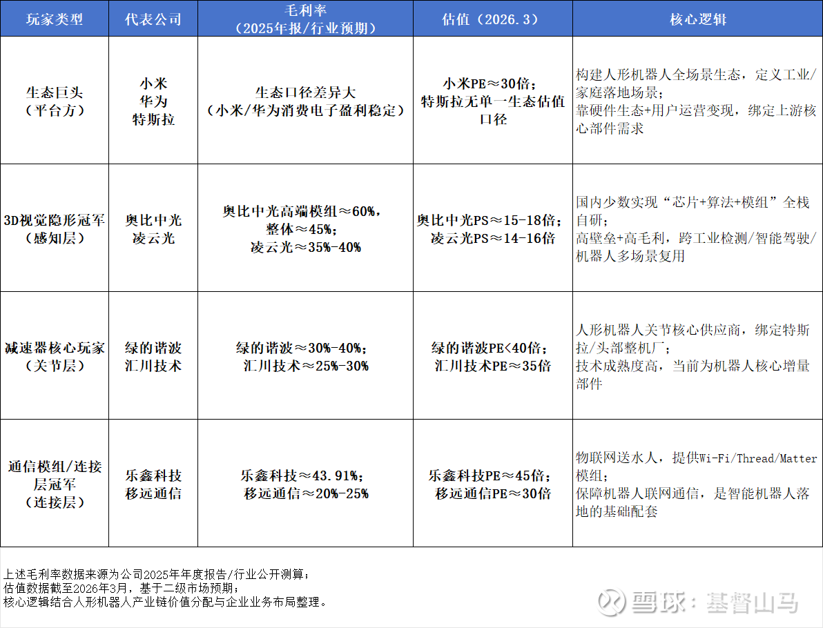 结合行业玩家类型、核心数据与业务逻辑,整理人形机器人核心产业链玩家核心特征表如下。
